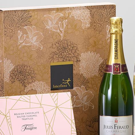 Featuring a 75cl bottle of Jules Feraud champagne and a box of Maison Fougère salted caramel chocolate truffles in a presentation box.