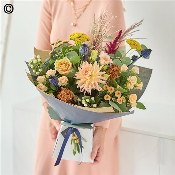 This handcrafted trending bouquet made by a local florist, will feature gorgeous blooms, foliage and dried flowers in muted colours like terracotta or silvery green.