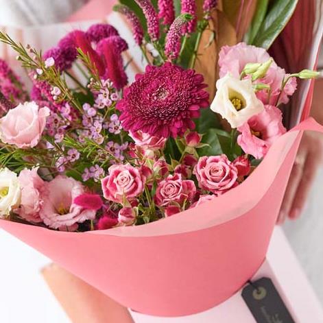 An on trend gift box handcrafted by their local florist featuring blooms in cerise and purple tones, with soft pink, peach or lilac shades. It might also feature dried flowers or foliage painted in copper or rose gold.