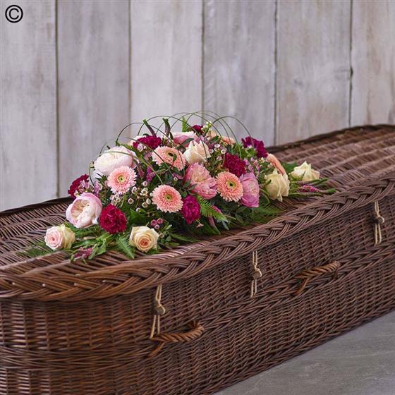 A beautiful spray of pastel blooms, including germini, roses, and carnations, arranged in a linear design.