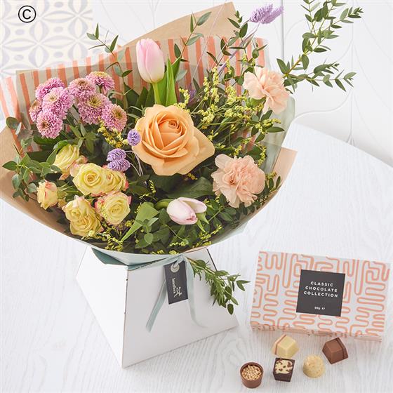 A handmade bouquet of fresh flowers in soft pastel shades, plus a selection of scrumptious chocolates.